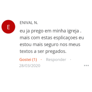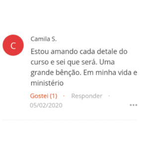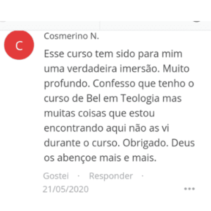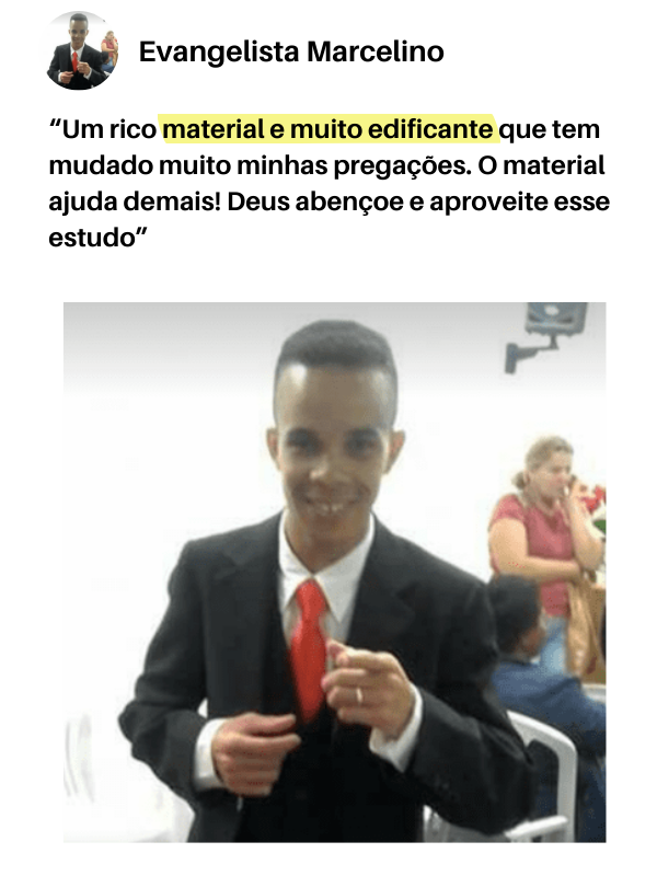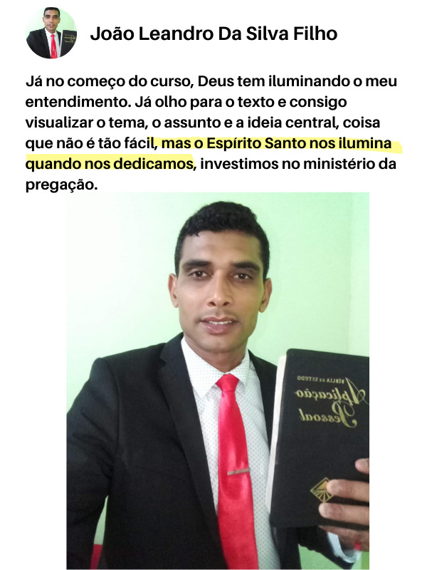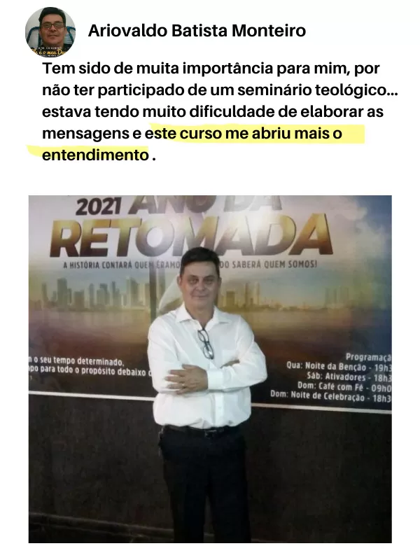 Estou bastante satisfeito com ambrangência do conhecimento que me foi proposta neste curso… Muito bom, excelente! Me sinto muito mais pronto e sem medo de fazer pregações e palestras… Muito obrigado!